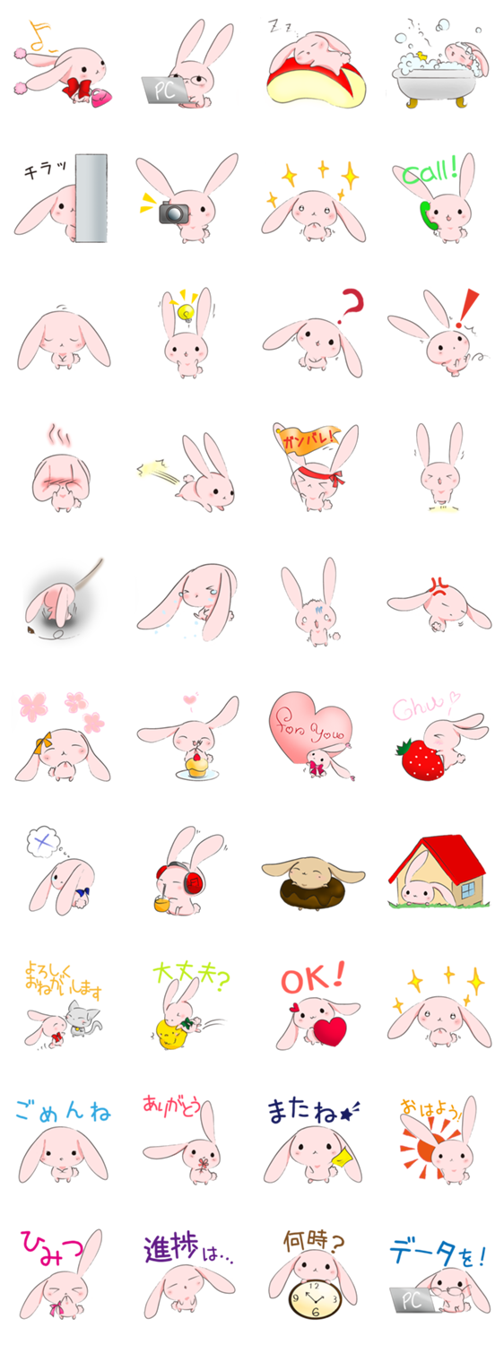 桜色の女の子のうさぎ。実はOLです。男の子のねこやひよこたちと仲良しです。仕事でのやりとりや、普段使いがしやすいものまで、幅広くご利用ください。