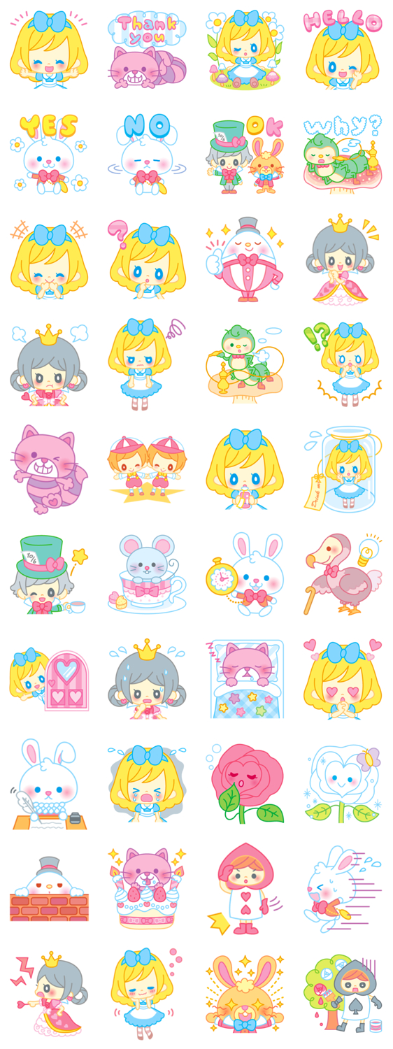 スタンプ説明 イラストレーターりぃが描く「不思議の国のアリス」、「鏡の国のアリス」に登場する愉快なキャラクターたちのスタンプ。なんでもない日おめでとう!