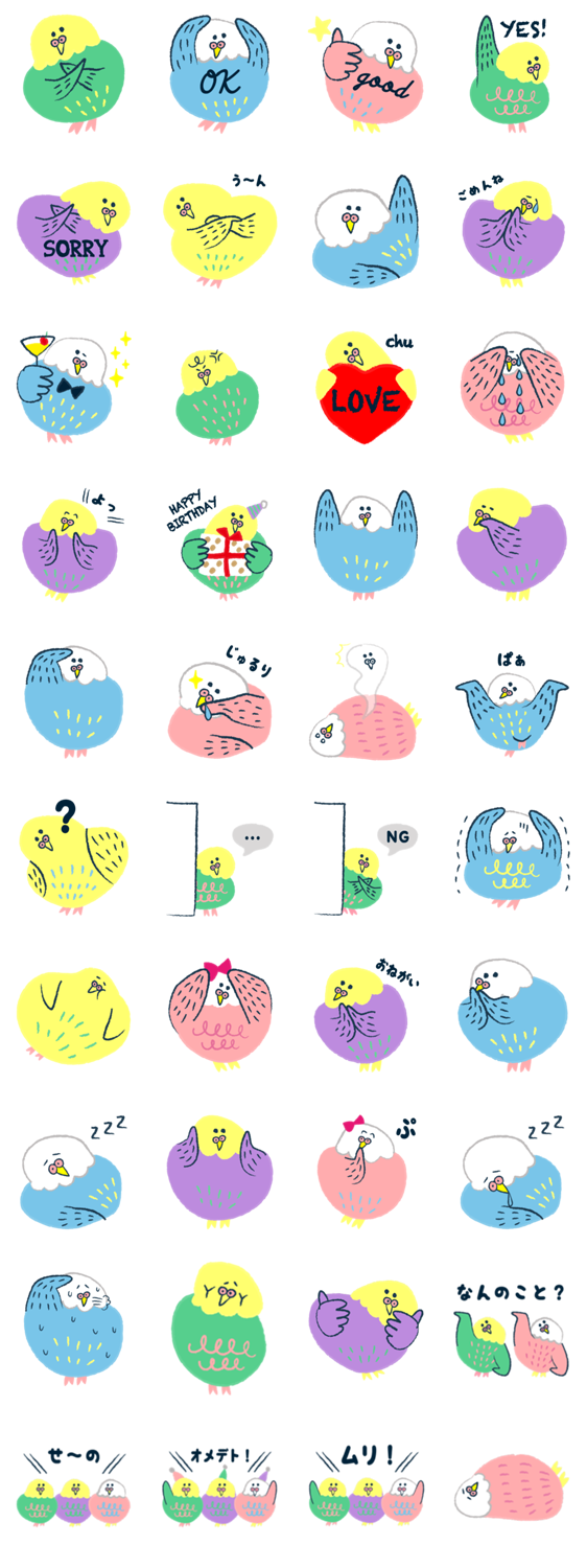 スタンプ説明 ぽよぽよかわいいメタボなインコさんたちのスタンプです。たまにニクたらしいインコさんもいます。肉付きのいいインコさんにちょっぴりいやされるかも?