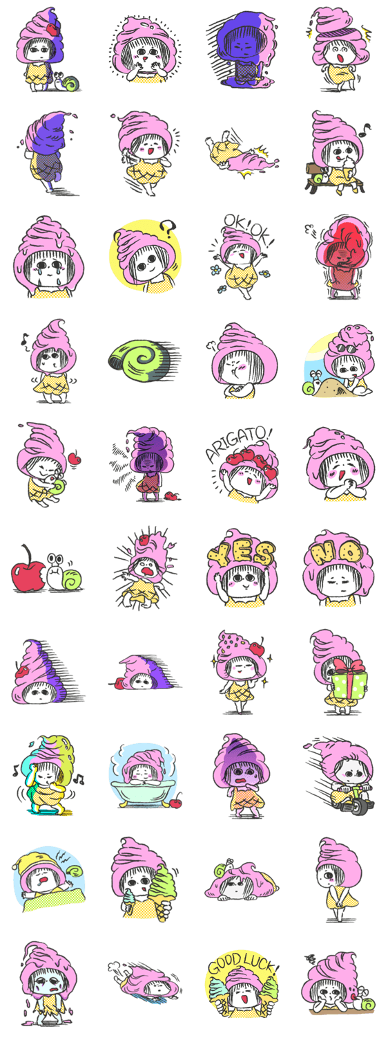 スタンプ説明 頭がいちごのソフトクリームでできている女の子。溶けそうになることもあるけれど、元気いっぱいです。