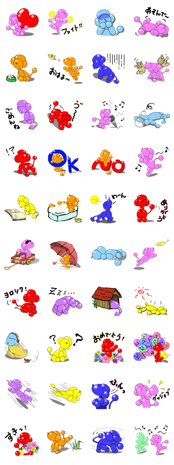 スタンプ説明 つやつやポコポコの風船犬「ココ」の日本語版が登場!気持ちの変化で色が変わるココが、喜んだり、怒ったり。日常会話で使いやすいものを集めています。