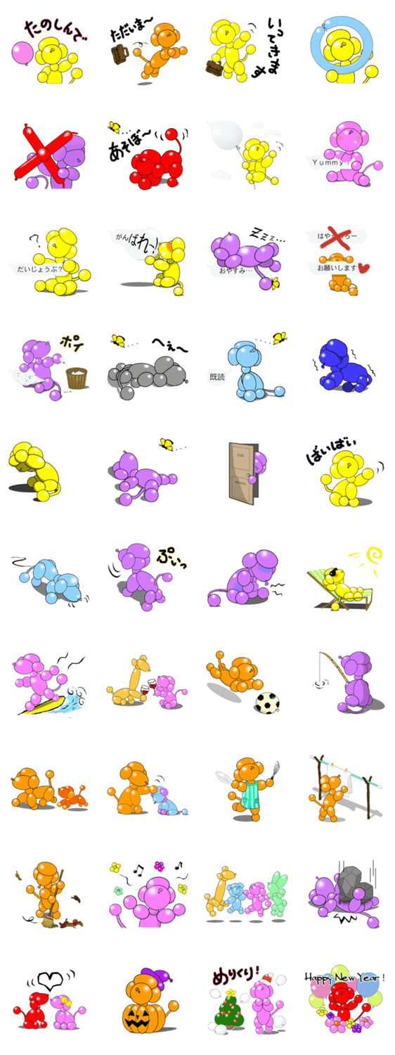 スタンプ説明 つやつやポコポコの風船犬「ココ」の日本語版第2弾が登場!気持ちの変化で色が変わるココが、喜んだり、怒ったり。日常会話で使いやすいものを集めています。