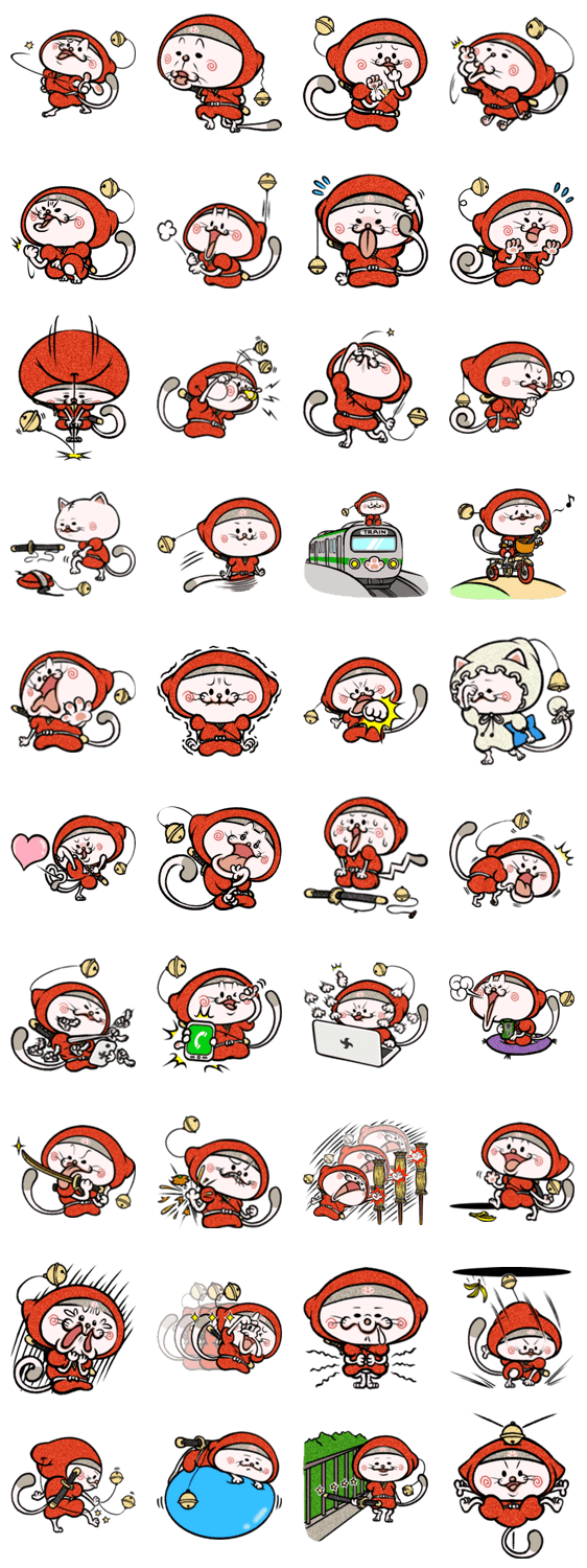 スタンプ説明 にゃんじゃの里を飛び出し都会へ上京。いつの間にやら落ち忍(落ちこぼれ忍者)から抜け忍(里を抜けた忍者)に成り下がった忍ねこにゃん蔵。今度は都会で気ままに暮らす。