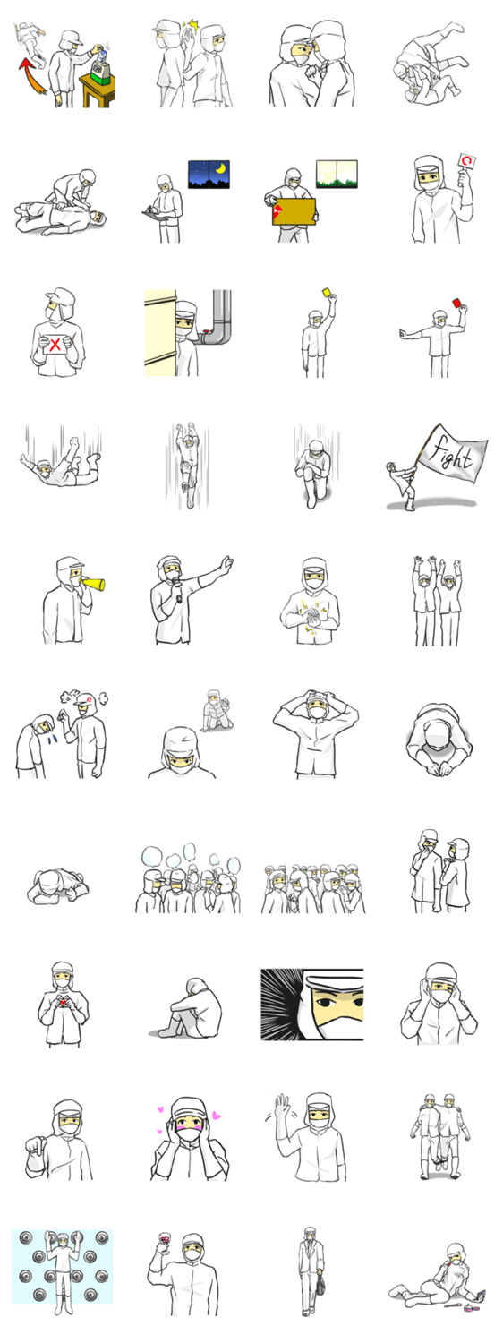 スタンプ説明 食品加工工場や精密機器の製造業など、日々モノ作りをしている人々がシュールで、大胆なスタンプになりました。シフト交代、人間関係、反省、応援などてんこもり。