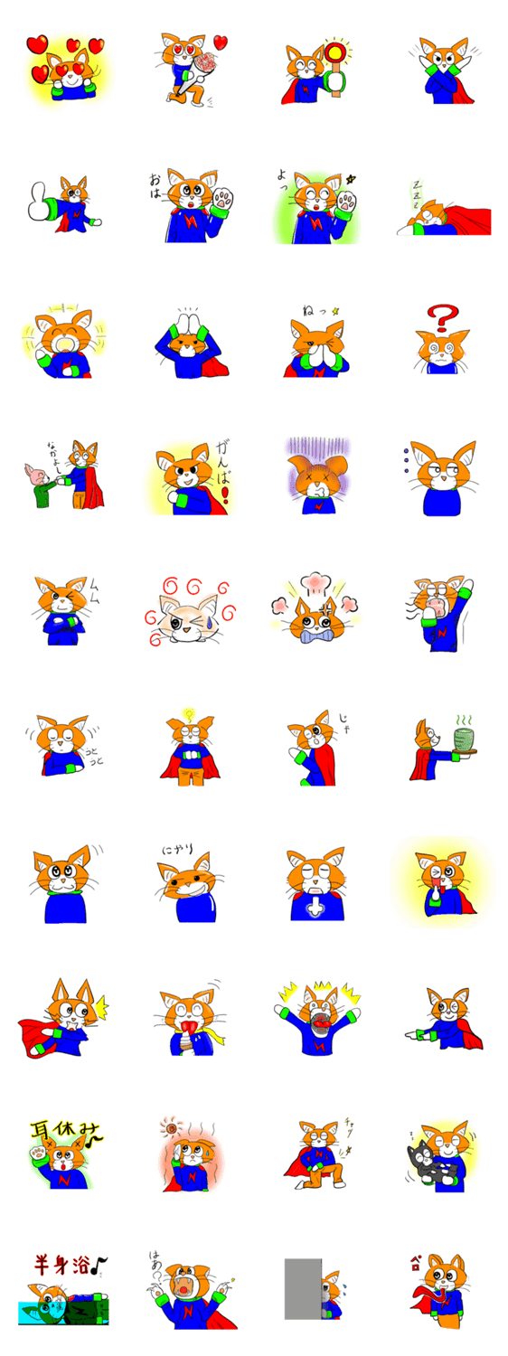 スタンプ説明 ニャンパンマンは地域を守るスーパーヒーローです。(自称)悪の組織である鉄仮面団と戦っています。好物はアイスクリームです。