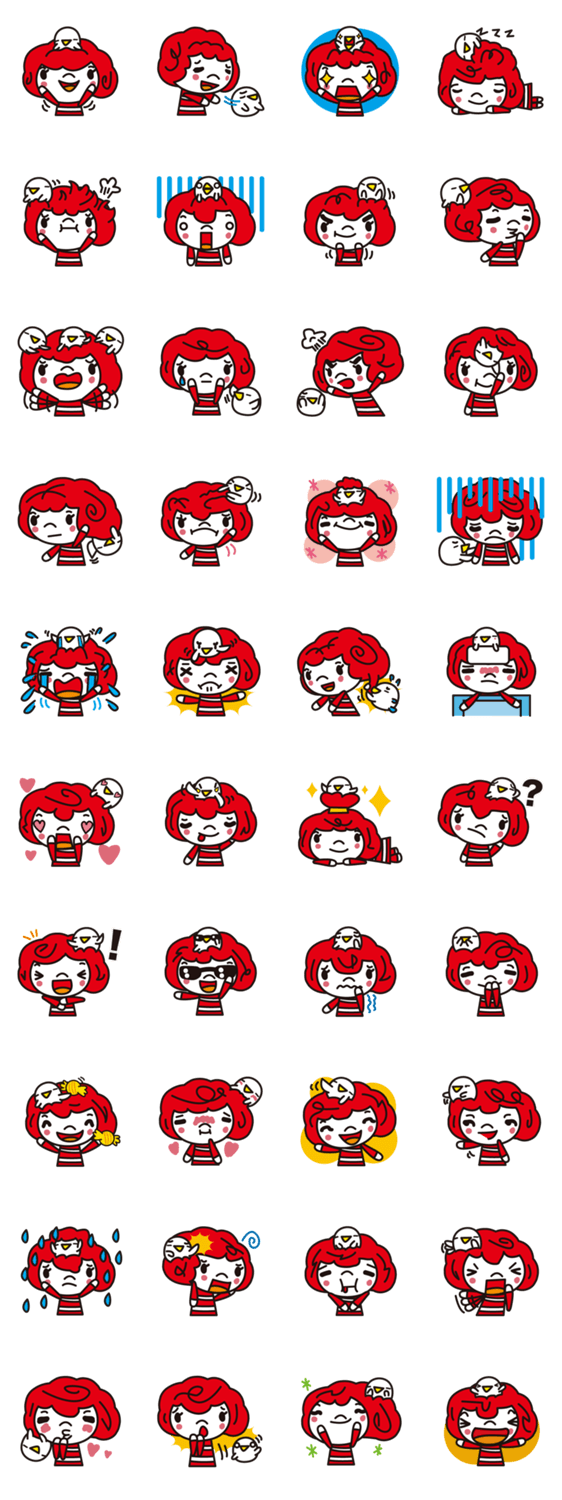 スタンプ説明 とりの巣頭、赤毛の女の子スタンプ。髪に住む友達、白い鳥とは仲良し。うれしい時かなしい時いつも一緒、病気の時は看病、恋愛、友達、泣く、笑うシンプルで使いやすいです