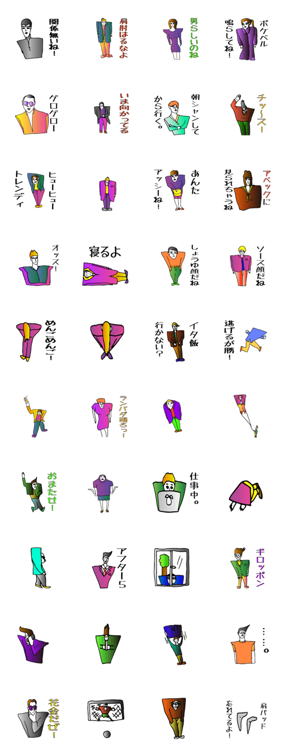 スタンプ説明 20XX年。再び肩パッドシティと化した東京。人々は自分を大きくみせるため肩パッドに頼るしかないのであった。