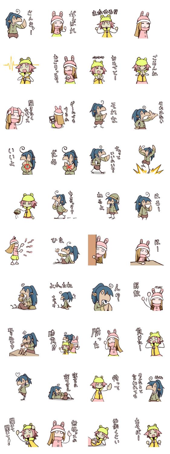 スタンプ説明 オリジナルキャラクターのトリスケ(茶色いの)、ラビ(うさぎっぽいの)、ゲッコ(かえるっぽいの)。不思議な生き物スタンプが日常生活を彩る!