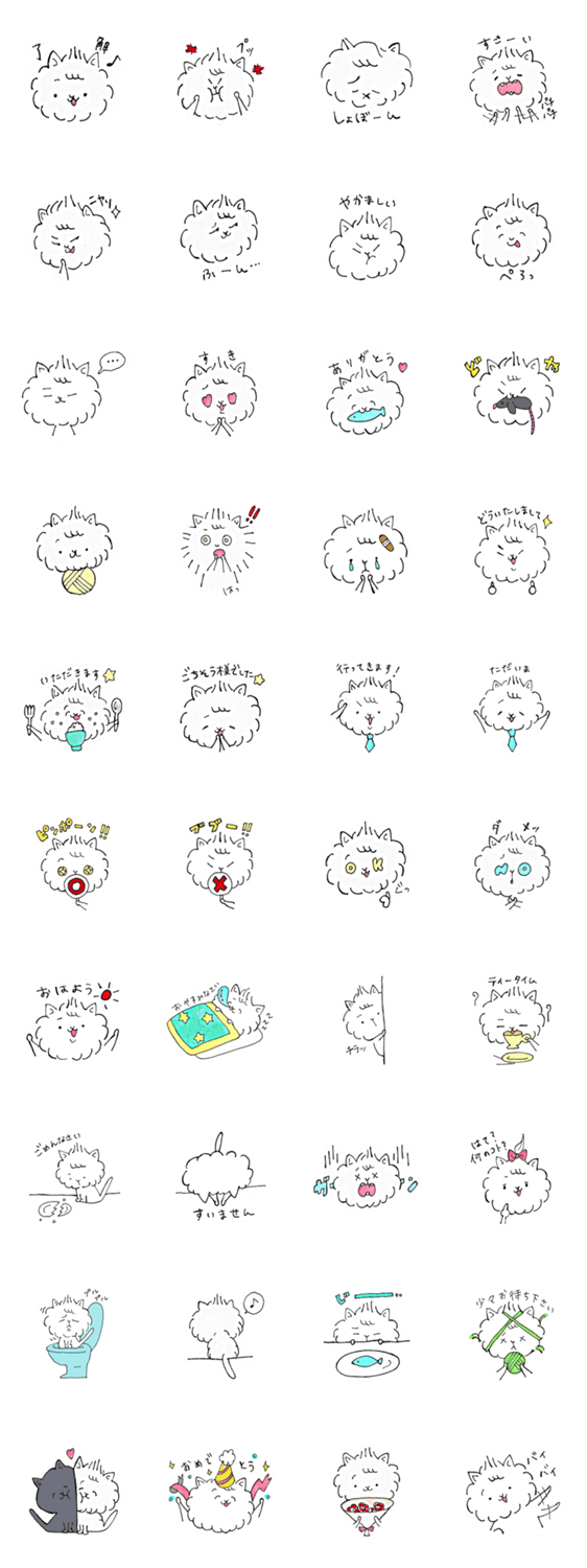 スタンプ説明 毛玉のような猫。やんちゃな男の子。喜怒哀楽が激しい。好奇心旺盛。柔らかく、ふわふわ。