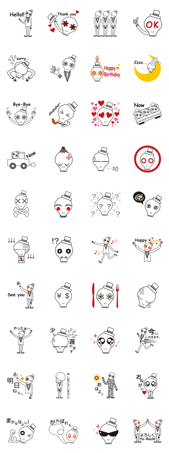 スタンプ説明 1日1日を全力で生きているサラリーマンのガイコツという設定。 愛くるしい表情で利用者の気持ちを代弁してくれます。