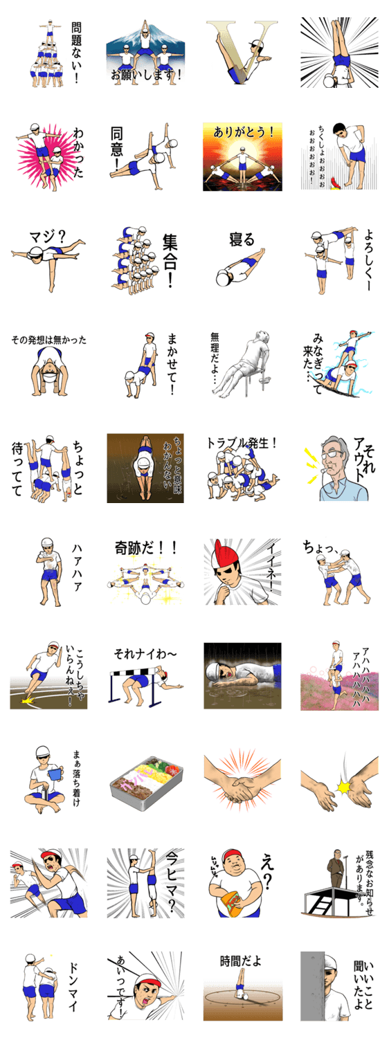スタンプ説明 全国に蔓延る運動会の謎種目「組体操」がスタンプになりました。日常会話に使えるものが満載です。