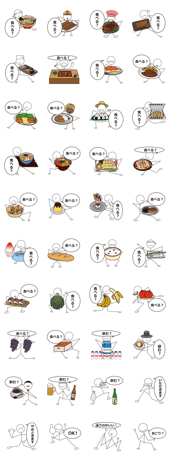 スタンプ説明 食事は大切、自分はこれを食べたいけど...って時にこのスタンプが役に立ちます。おなかいっぱい食べて楽しい時間を過ごしましょう!