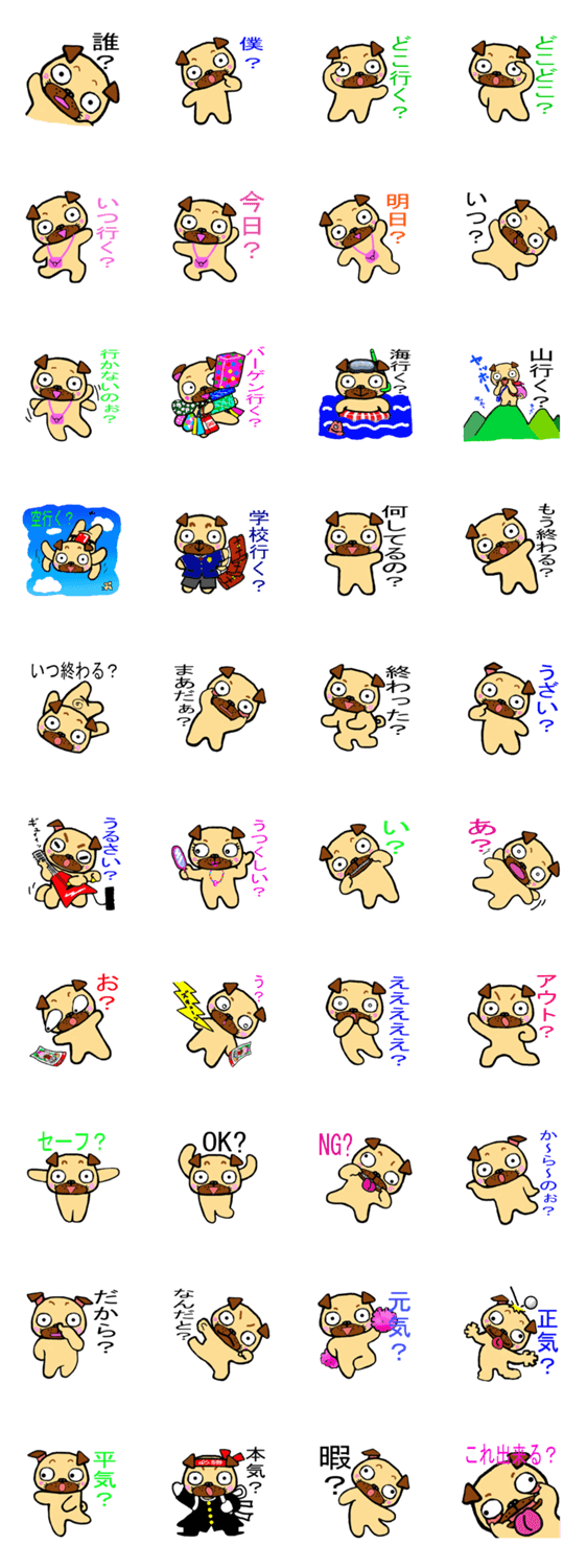 スタンプ説明 何でも聞きまくるかわいいパグのぷーちゃんのスタンプです。