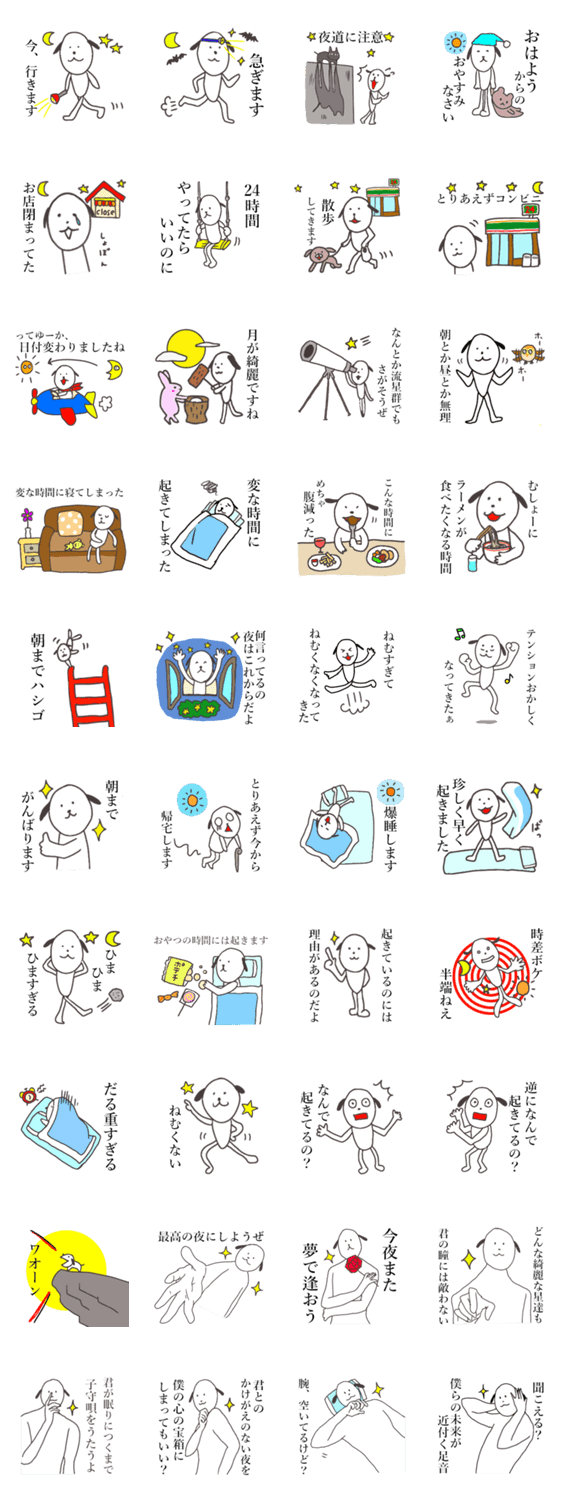 スタンプ説明 夜から朝方にかけて使う、白い犬のスタンプです。夜更かししている人、夜型の人、夜勤の人におすすめです。ゆるいワンコと、大人ワンコをセットにしました。