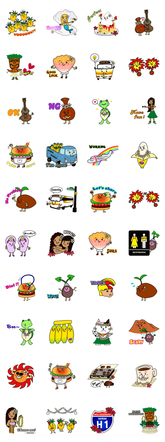 スタンプ説明 Aloha!みんなに愛されている”Ku'u Hoa”の第3弾。アメリカンポップなハワイのキュートな仲間達がまたまた大集合。あなたのお気に入りのKu'u Hoaを見つけて下さいね♪