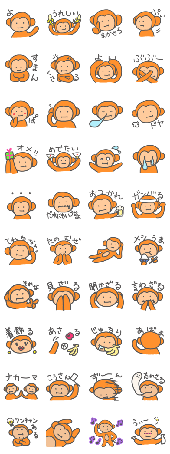スタンプ説明 2016年の干支、おさる(猿、申)です。手書きのゆるさと無表情さが何ともいえず、にくめない可愛さです。仲良しのお友達と使ってください♪
