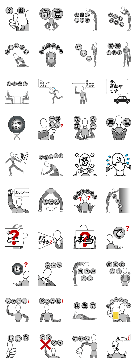 スタンプ説明 無表情のロボットは、使う人によってさまざまな表情を持つことでしょう。シニア世代も重宝するスタンプです。