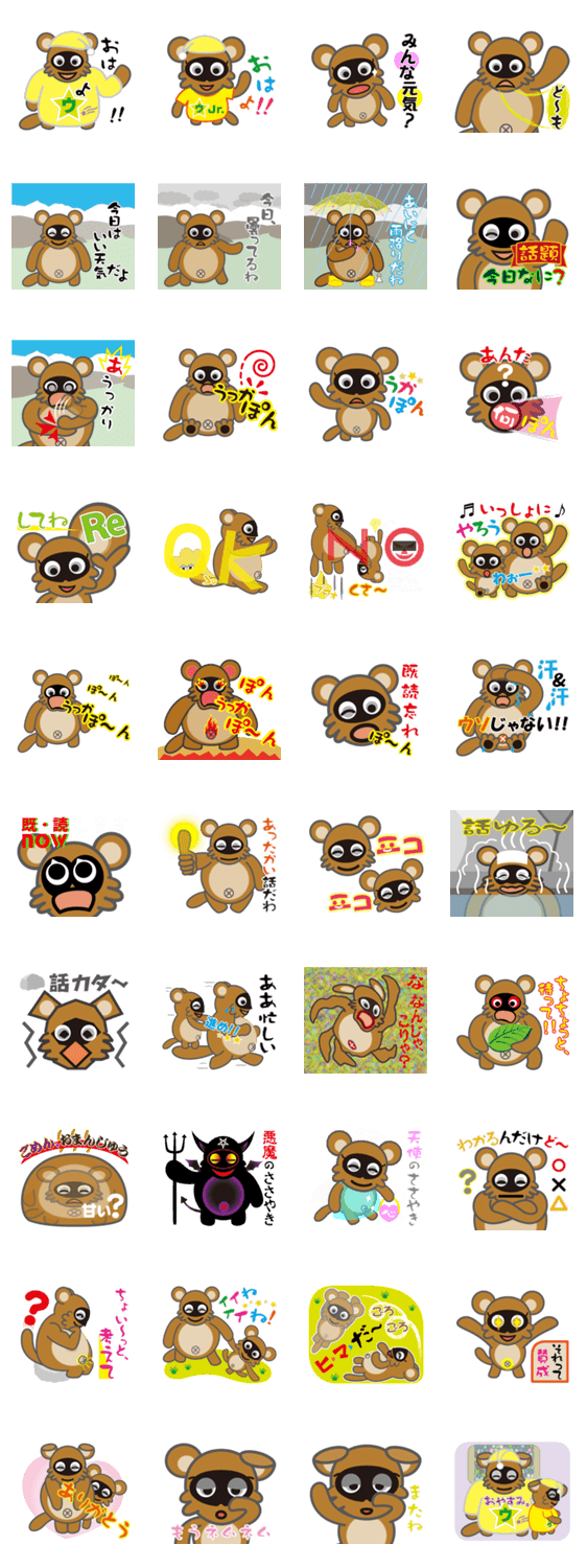 [ウッカポン特集]日本一のうっかり者タヌキで、日常のスタンプを作ってみました。その口ぐせに注目、ジュニアもしっかりと登場し親子の競演です。お楽しみ下さい!!