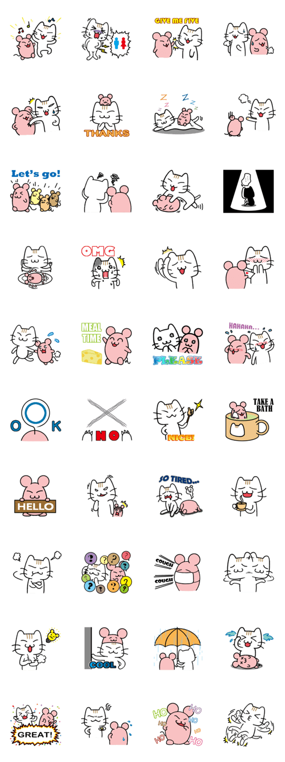 スタンプ説明 白い子猫のニャーニャとピンク色ねずみのチューチュはとても仲のいい友達。この子達と仲間になって、一緒に遊ぼう!