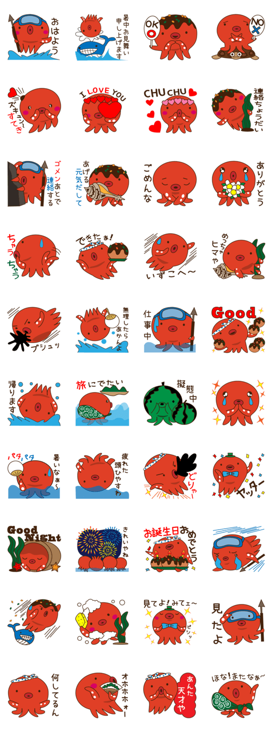 スタンプ説明 たこやき屋!たこタコちゃんは、たこやき屋の店主。海が大好きで恋愛中バレンタインOk。関西(大阪弁)たこタコちゃん!男子,女子,主婦,サラリーマン,学生のみなさんへ。