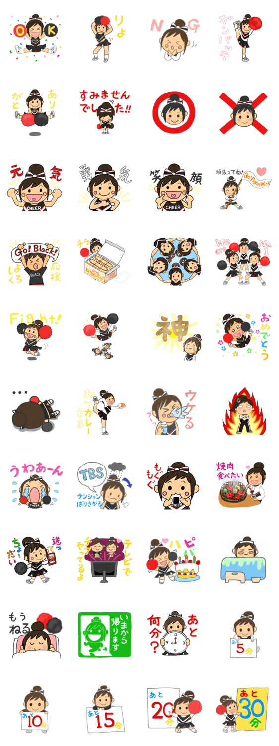 スタンプ説明 チア黒ユニフォームバージョン2です。部活や、チーム、家族への連絡用や会話に使ってね。 元気! 勇気! 笑顔! (赤、紫、青ユニフォームバージョンも発売中)