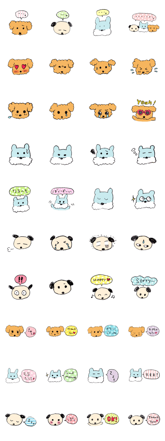 スタンプ説明 3匹の犬のらくがきスタンプです。プードルのまろちゃんとスコティッシュテリアのれおくんと雑種のころちゃんのスタンプです。