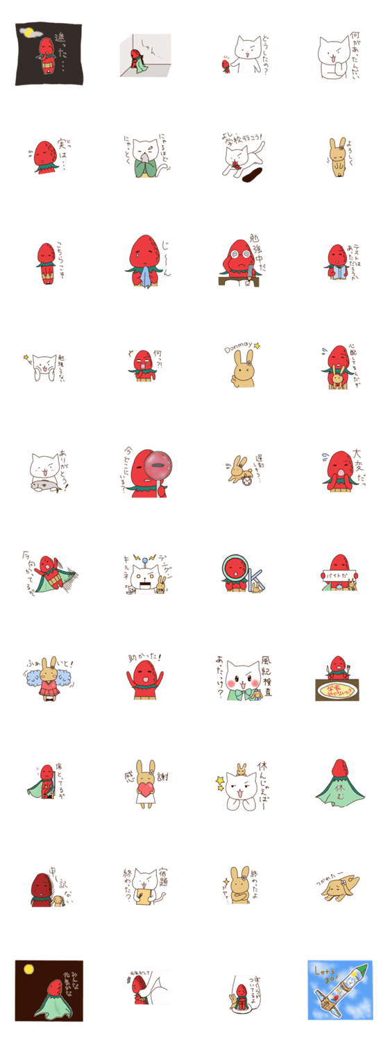スタンプ説明 月から地球に迷い込んだ、かぐやいちご。地球の仲間たちと一緒に学校に通うことになりました。かぐやいちごと仲間たちがあなたの学校生活を応援します。