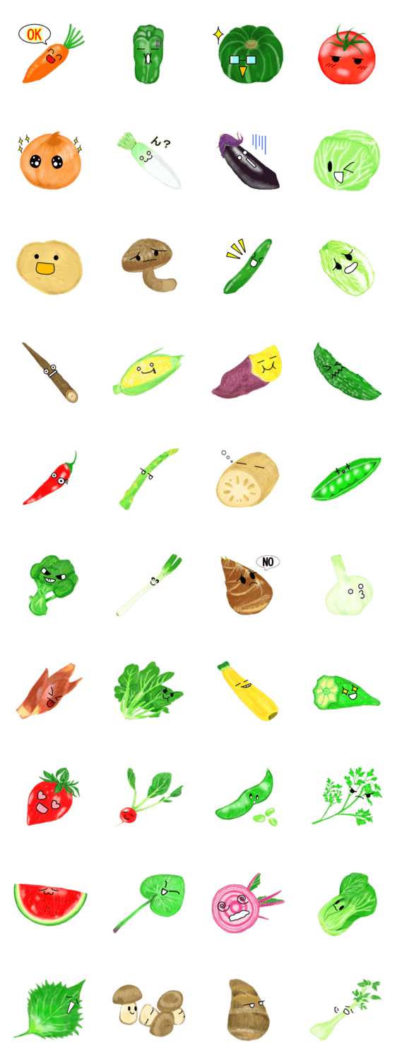 スタンプ説明 40種類の野菜に表情をつけました♪言葉が無いのもあるので、お買い物を頼むときにも使えるかも!?