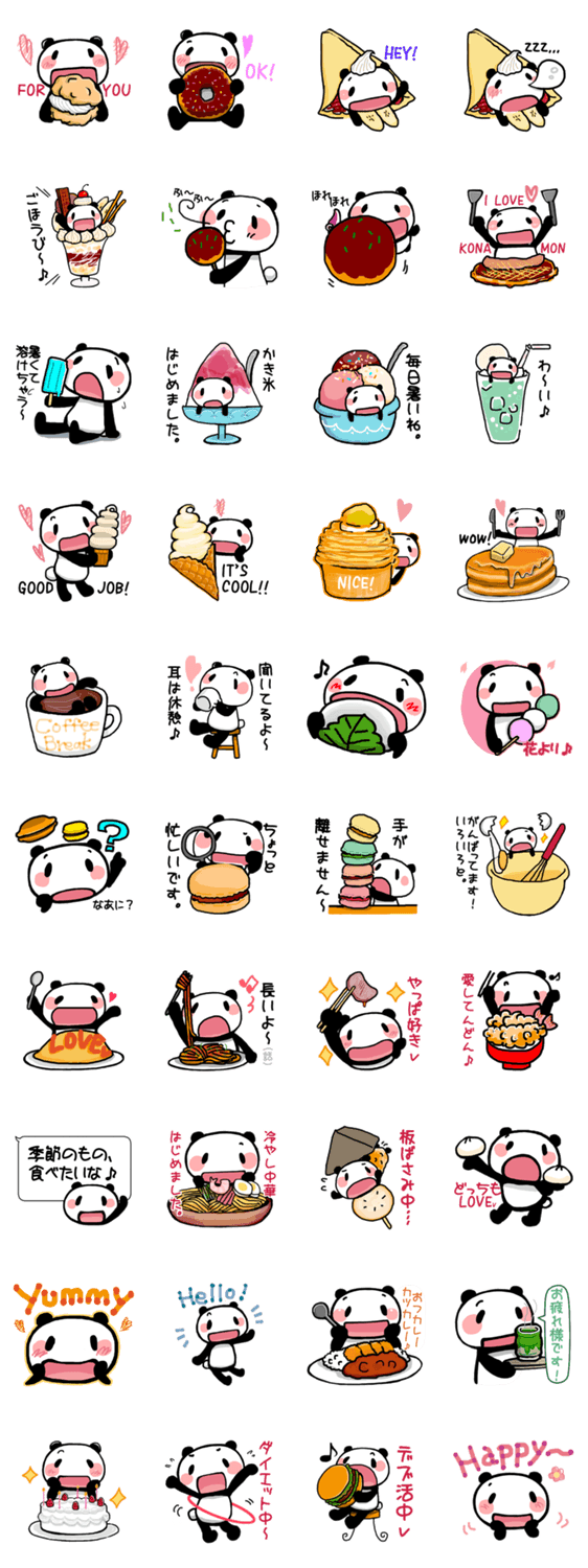 スタンプ説明 パンダのゆるぱんちゃんが,これ食べたい!って言ってますよ♪おなかすいた時,話題に困った時,話のきっかけ,その時の気分&挨拶に使って!暑い時こそ暑中見舞いにぜひ!