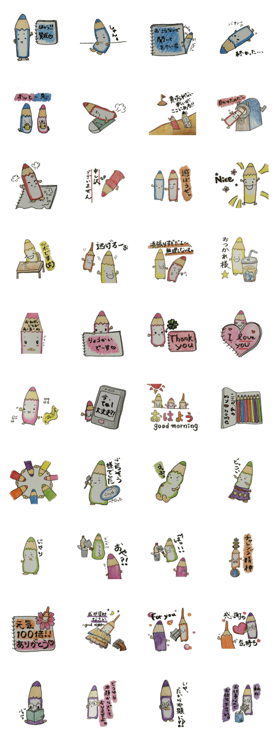スタンプ説明 1本づつ性格が違う7色のいろえんぴつ。そんないろえんぴつ達の日常をスタンプにしました。