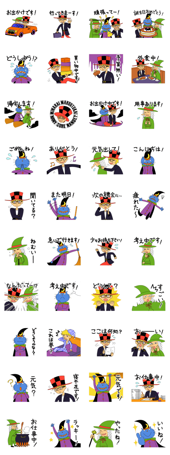 スタンプ説明 見習い魔法使い ナニーソレナンデ?が開催している「世界一小さなマジックショー」のハロウィンイメージのスタンプ待望の第二弾です!楽しい仲間も登場いたします!