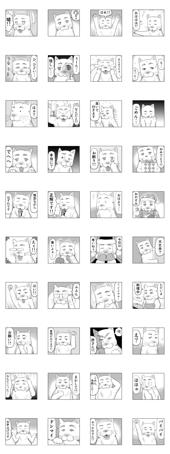 スタンプ説明 漫画風のコマスタンプ「漫画で応答スタンプ」シリーズ。今回は、かわいい猫にも見える、まゆげ犬のスタンプです。ちょっとした応答やリアクションなどにお使いください。