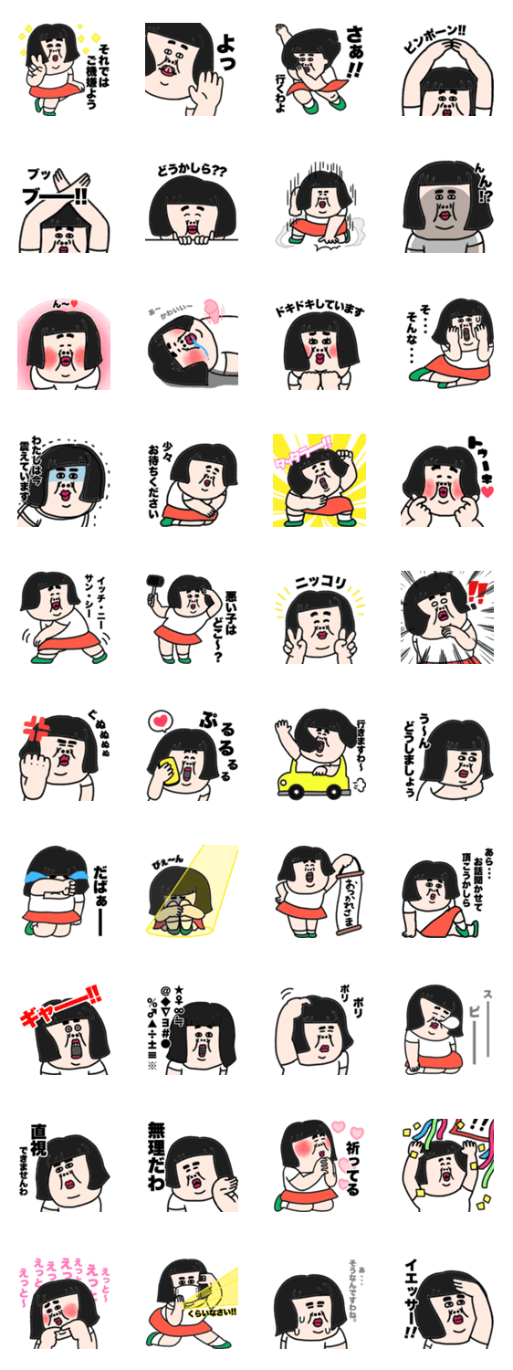 ブス可愛い花園百合子さんのスタンプです。個性的な顔をしてますが、見れば見るほど愛着が湧くこと間違いありません。