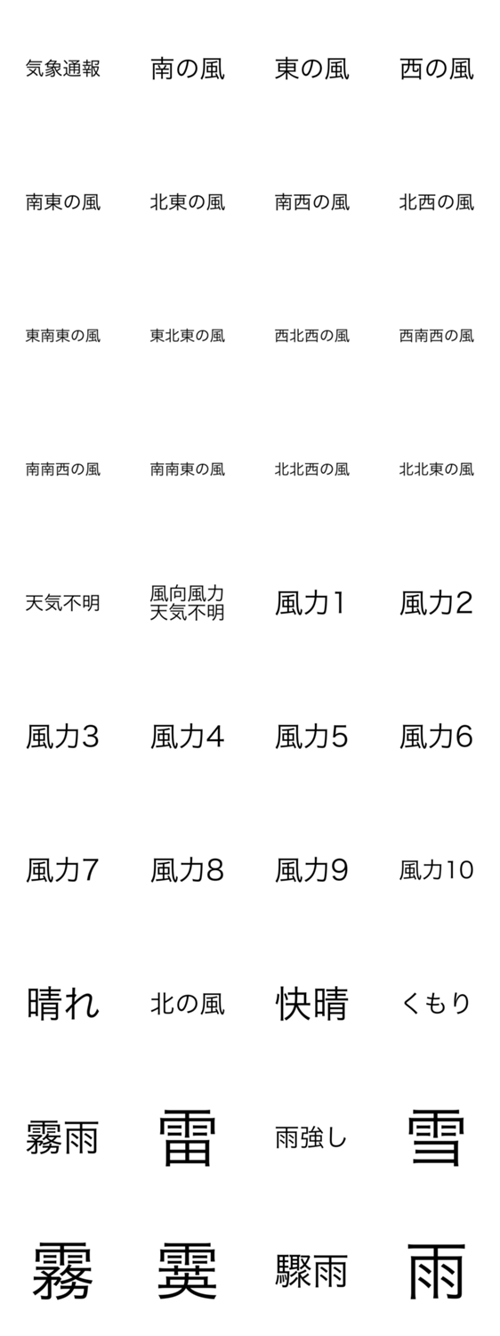午後4時からラジオで流れる気象通報を伝えるためのスタンプです。①はよく使うもの。②は珍しいもの。