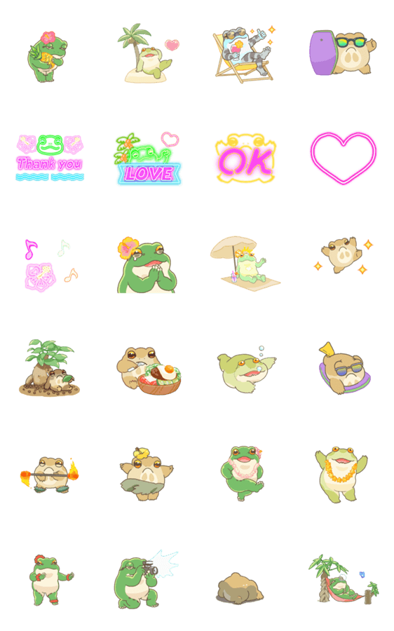 ちょっと南国風。スタンプアレンジ機能で組み合わせて遊べます。カエル好きさんにどうぞ。