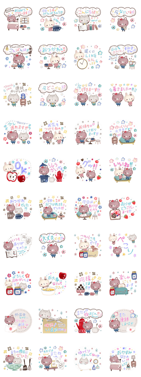北欧雑貨がかわいいアンティークレトロな熊くま、うさぎ、猫ねこのお部屋の中スタンプ。敬語感謝気遣い挨拶などの基本セットプラス、家族間友達間におすすめな状況報告含む