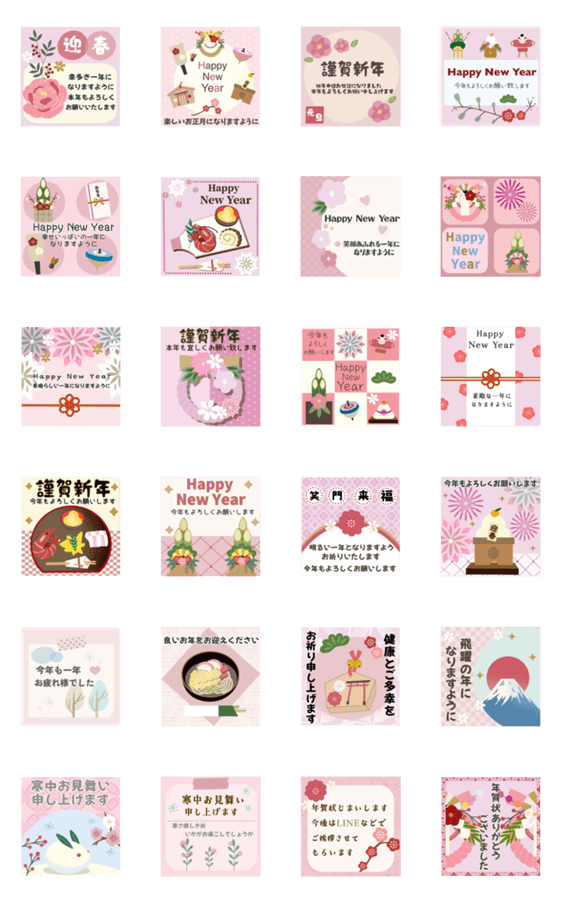 ピンクで可愛い毎年使えるスタンプです。 (お正月/大人可愛い/年賀状/2025年/令和7年/巳年/謹賀新年/寒中見舞い/年賀状じまい/年末年始/冬/あけおめ/ことよろ/大晦日/挨拶