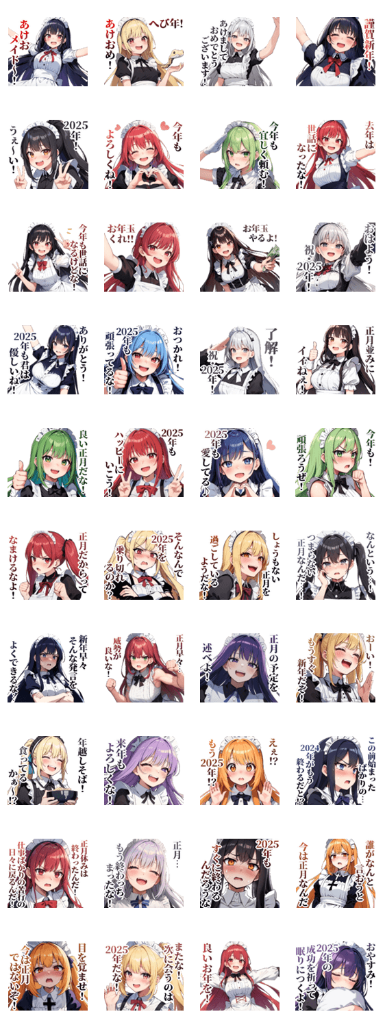 お正月や年末年始に使えるメイドさんのスタンプです!2025年,新年,元旦,元日,お年玉,年越しそば,カウントダウン,大晦日,蛇年,巳年。あけましておめでとうございます!