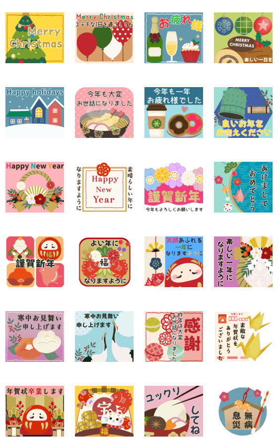 大人可愛い背景が動くスタンプです。 (クリスマス/年越し/大晦日/良いお年を/正月/あけおめ/ことよろ/謹賀新年/年賀状じまい/寒中見舞い/開運/おめでとう/友達/年賀状)