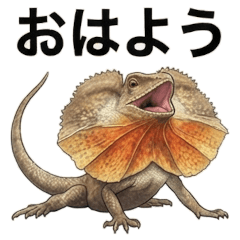 スタンプ説明 エリマキトカゲが感情豊かに挨拶や返信を伝えます。リアルな質感が魅力の、毎日使いやすいスタンプセットです。爬虫類好きな方へのメッセージにぜひご活用ください。