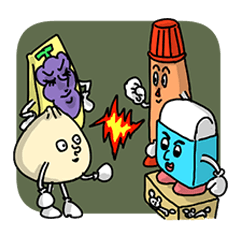 スタンプ説明 コンビニに住む人気者、肉まんくんとぶどうくんvs売れない文房具、のり子とけし男。バチバチとお互いにライバル意識はあるものの、仲はなんだかんだでいい。