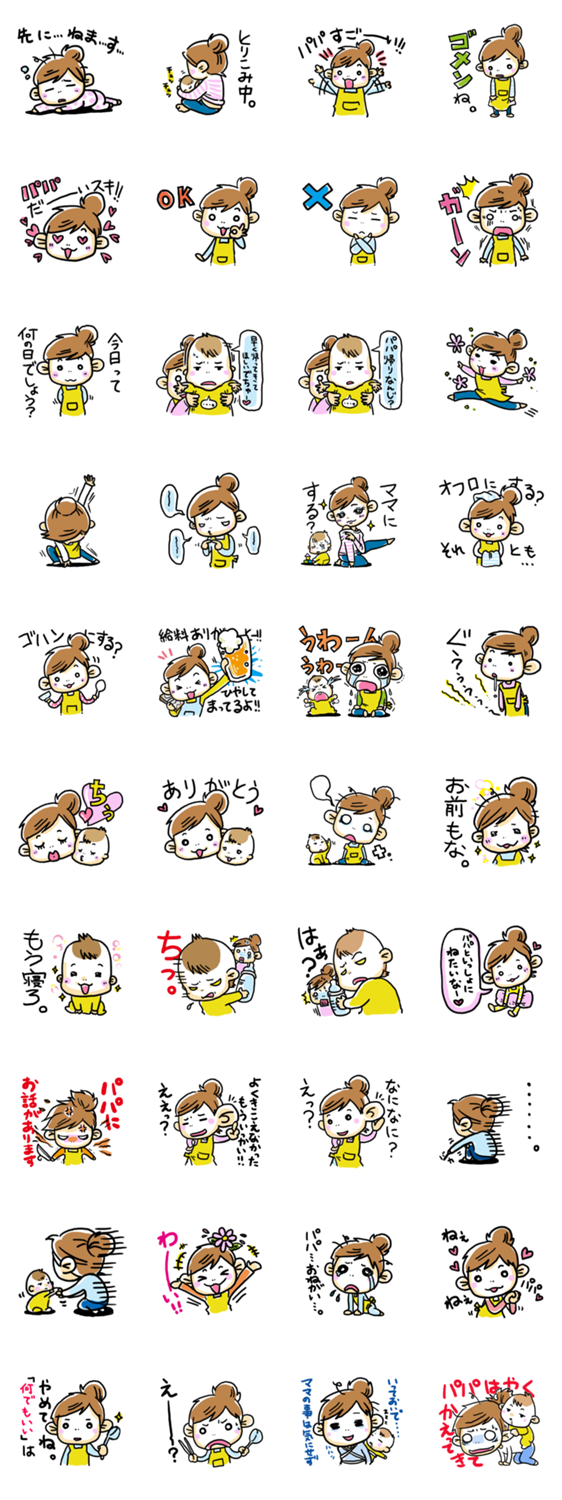 スタンプ説明 世の中のママ達の気持ちを代弁する為のスタンプです。普段言えない、文句・愛の言葉・感謝 などなど…。パパに伝えるお手伝いができればいいなと思います。