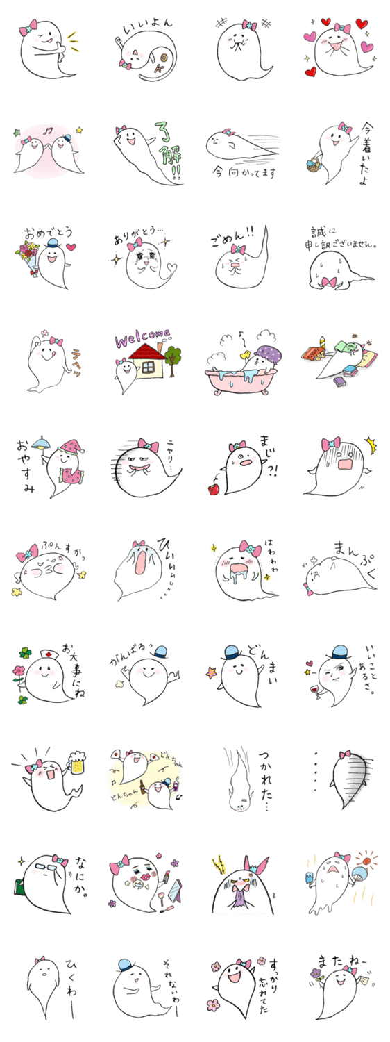 スタンプ説明 キュートなオバケの女の子、バケ子ちゃんのスタンプです。