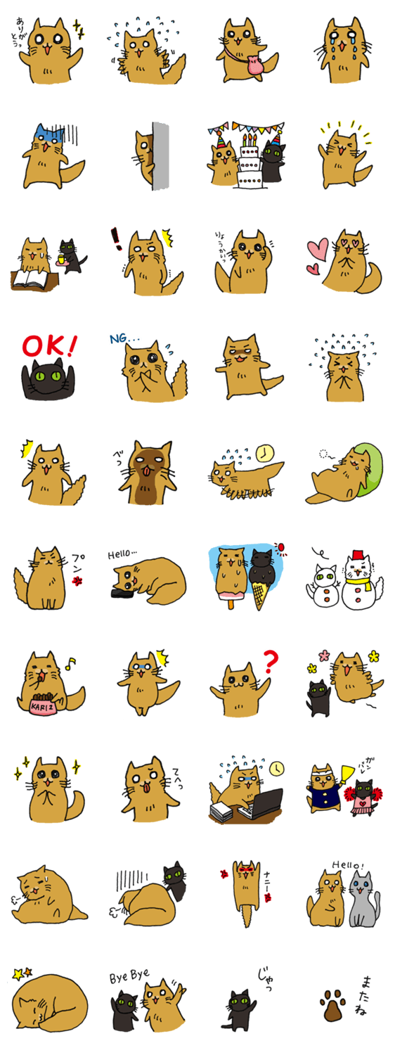 スタンプ説明 血統書付きペルシャ猫のムーピーと同居猫のクロ(ミックス)が楽しく過ごす、ユル~い日々のスタンプ。