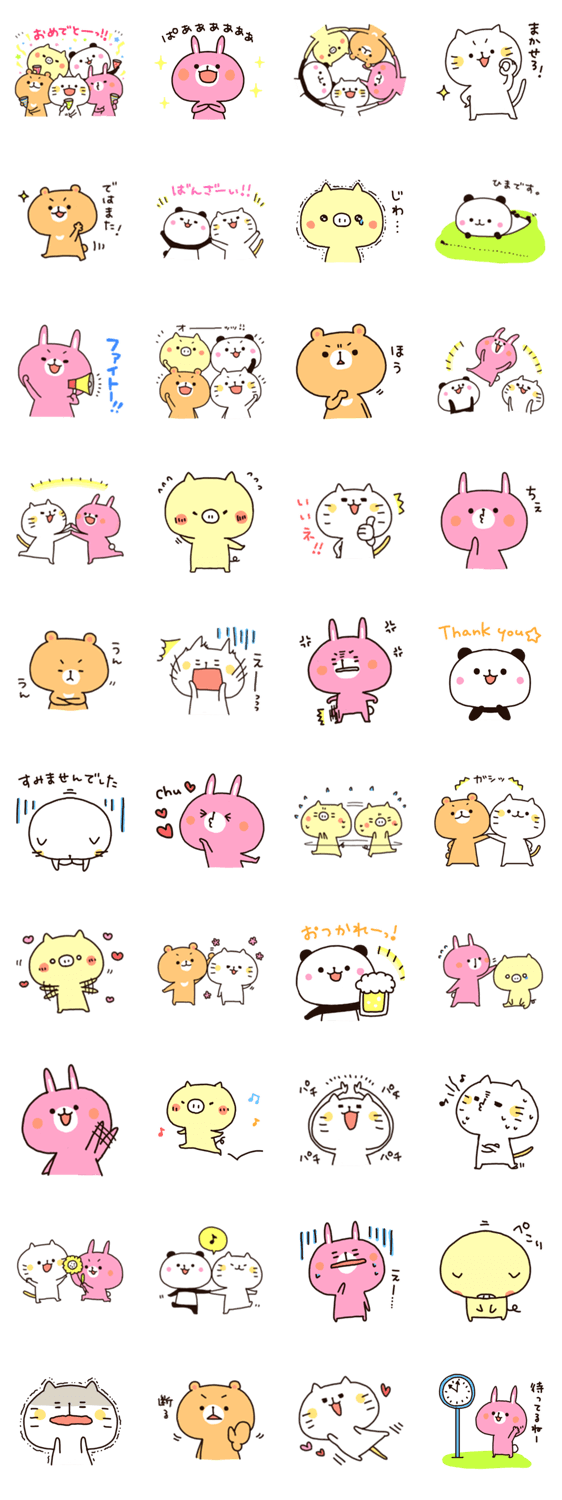 スタンプ説明 いつも仲良し5人組の「なかよしスタンプ」!友だちとの会話にピッタリな表情を集めました♪みんなで使って楽しんでね☆