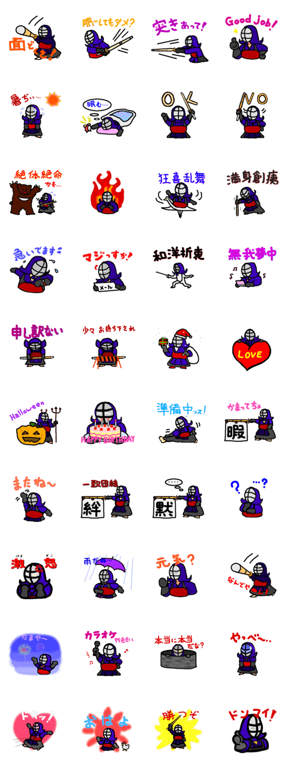 スタンプ説明 剣道部のスタンプ剣士君 ハロウィンやクリスマスの季節物スタンプもあって使いやすいよ。武道系の部活やってる方に使ってもらえたら嬉しいです。白道着の第2弾も宜しく