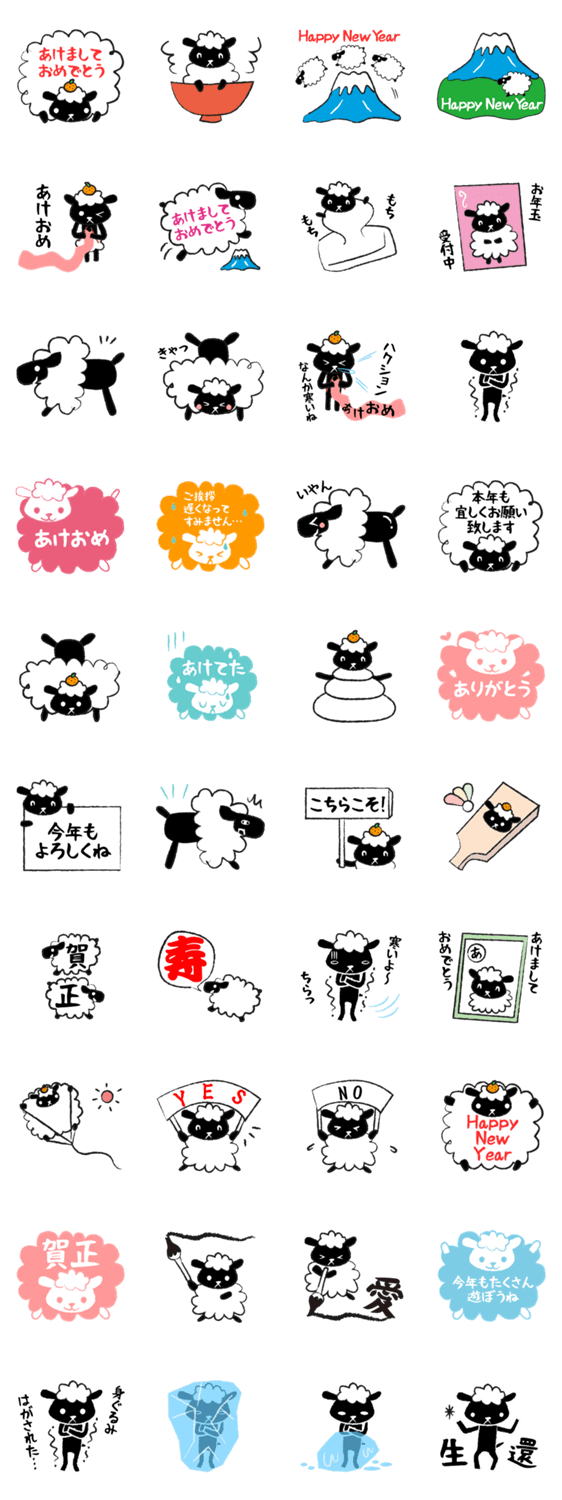 可愛い羊の年賀用。新年のあいさつ、あけおめメール、Happy New Yearの言葉をスタンプで。賀正や謹賀新年、寿の文字、富士山、干支のひつじが寒くて凍ってるイラストです。