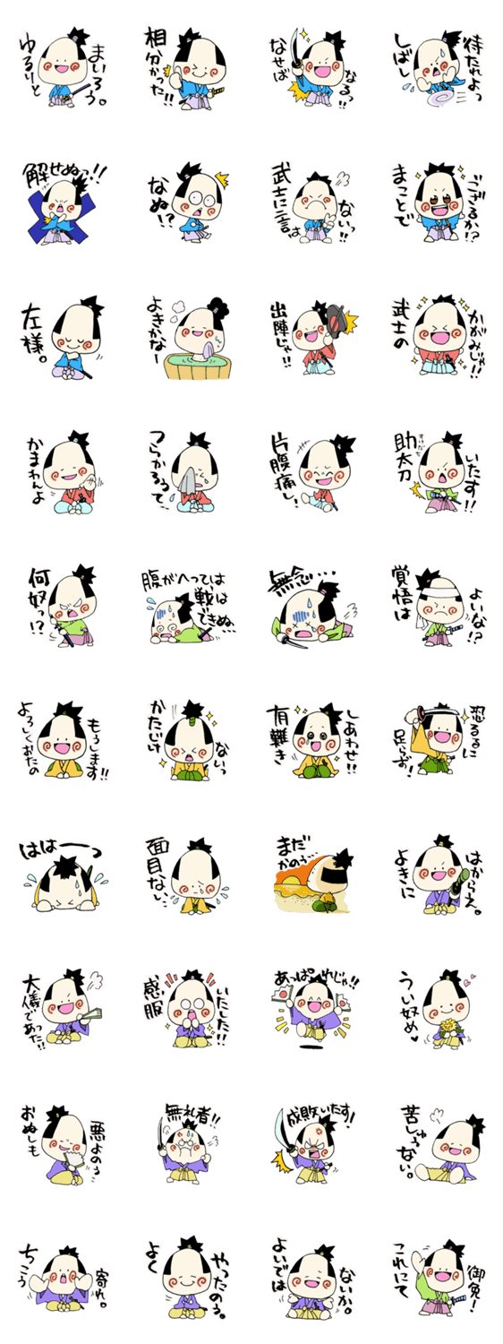 スタンプ説明 ときには謙虚に、ときには上から言ってみたり。身分不詳のゆるゆるな侍が、あなたのお供をいたします!