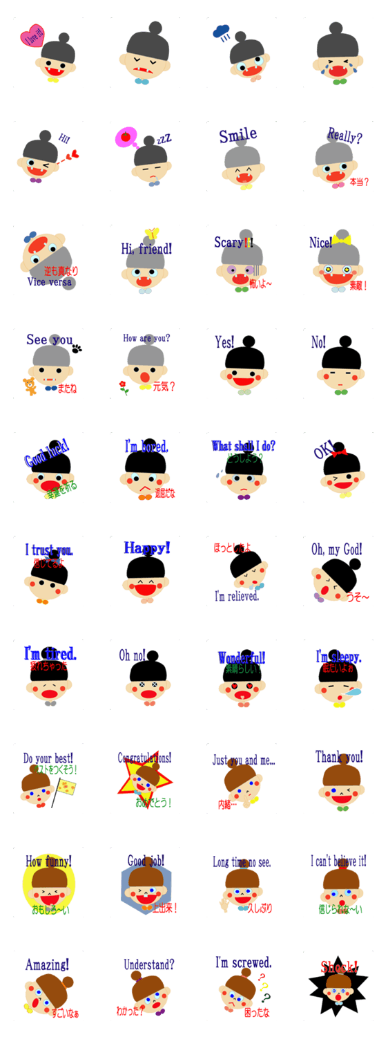 スタンプ説明 お団子頭の女の子の色んな表情と英語のメッセージを楽しんでね!