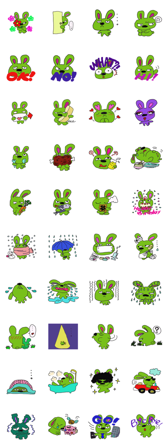 スタンプ説明 不機嫌なくさみどり うさぎです。でも憎めないやつです。気に入ってくれたらうれしいです。